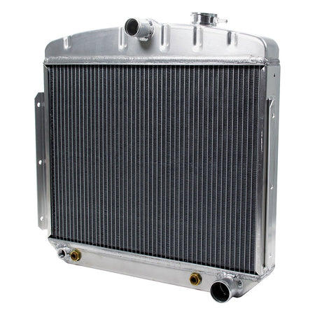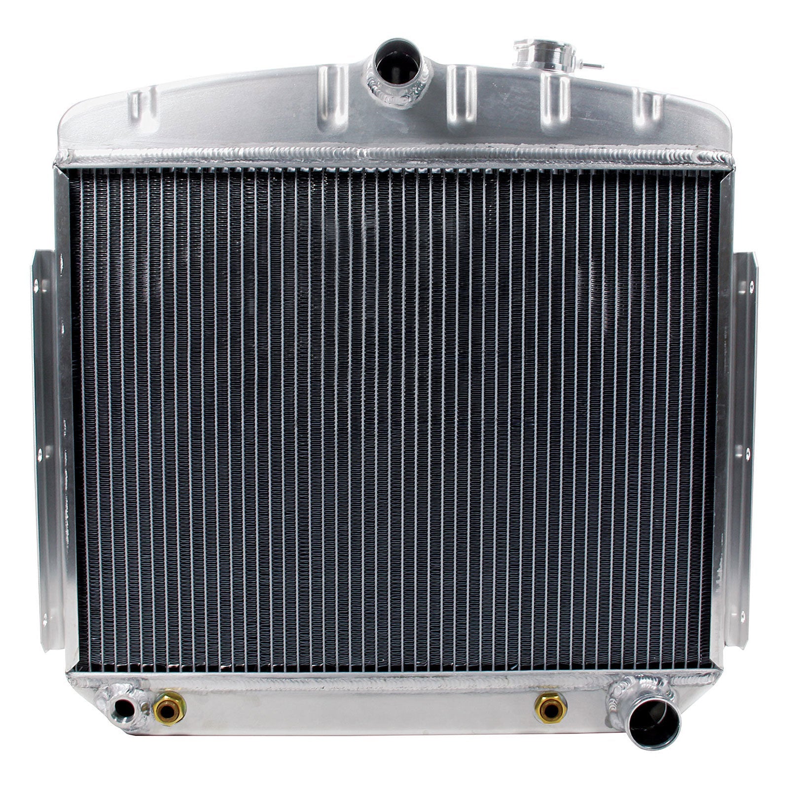 A direct replacement for all 1955-56 Chevy passenger cars with six cylinder engines, also ideal for 1955-57 Chevy V8’s with long style water pumps. Radiator has mounting brackets that position it in front of the core support bar, two rows of 1" tubes, furnace brazed tanks, a machined billet filler neck with over flow fitting, drain petcock, 1/2"NPT bung for additional temperature sender/switch and mounting clips. The built-in automatic transmission cooler has 1/4"NPT fittings. 23-1/4"H x 23-1/4"W. Core width is 22".