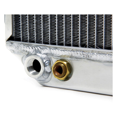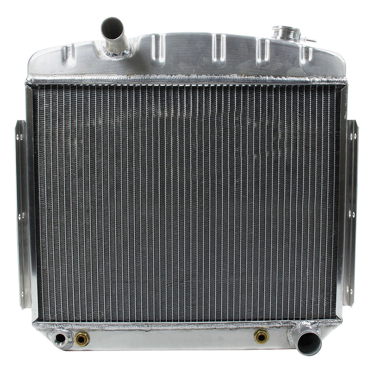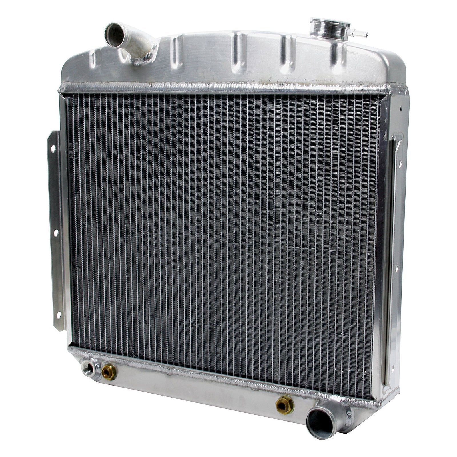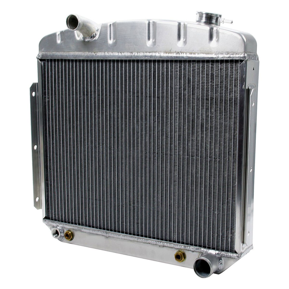 A direct replacement for all 1957 Chevy passenger cars with six cylinder engines, also ideal for V8’s with long style water pumps that require additional space between engine and radiator. Radiator features mounting brackets that position the radiator in front of the core support bar, two rows of 1" tubes, furnace brazed tanks, a machined billet filler neck with over flow fitting, drain petcock, 1/2" NPT bung for additional water temperature sender/switch and mounting clips. The built-in automatic transmission cooler has 1/4" NPT fittings. 23-1/4"H x 23-1/4"W. Core width is 22".