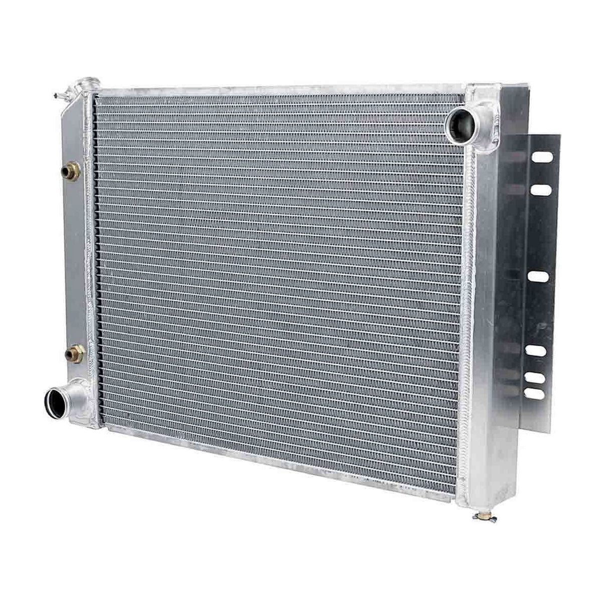 Aluminum direct fit radiators provide increased cooling over original copper radiator. Designed for performance vehicles, features include machined billet aluminum filler necks, fully welded construction and two rows of large 1" tubes properly spaced for maximum airflow and cooling on the street, even at lower speeds. Built-in automatic transmission coolers. O.E. fan shrouds may require modification for installation.