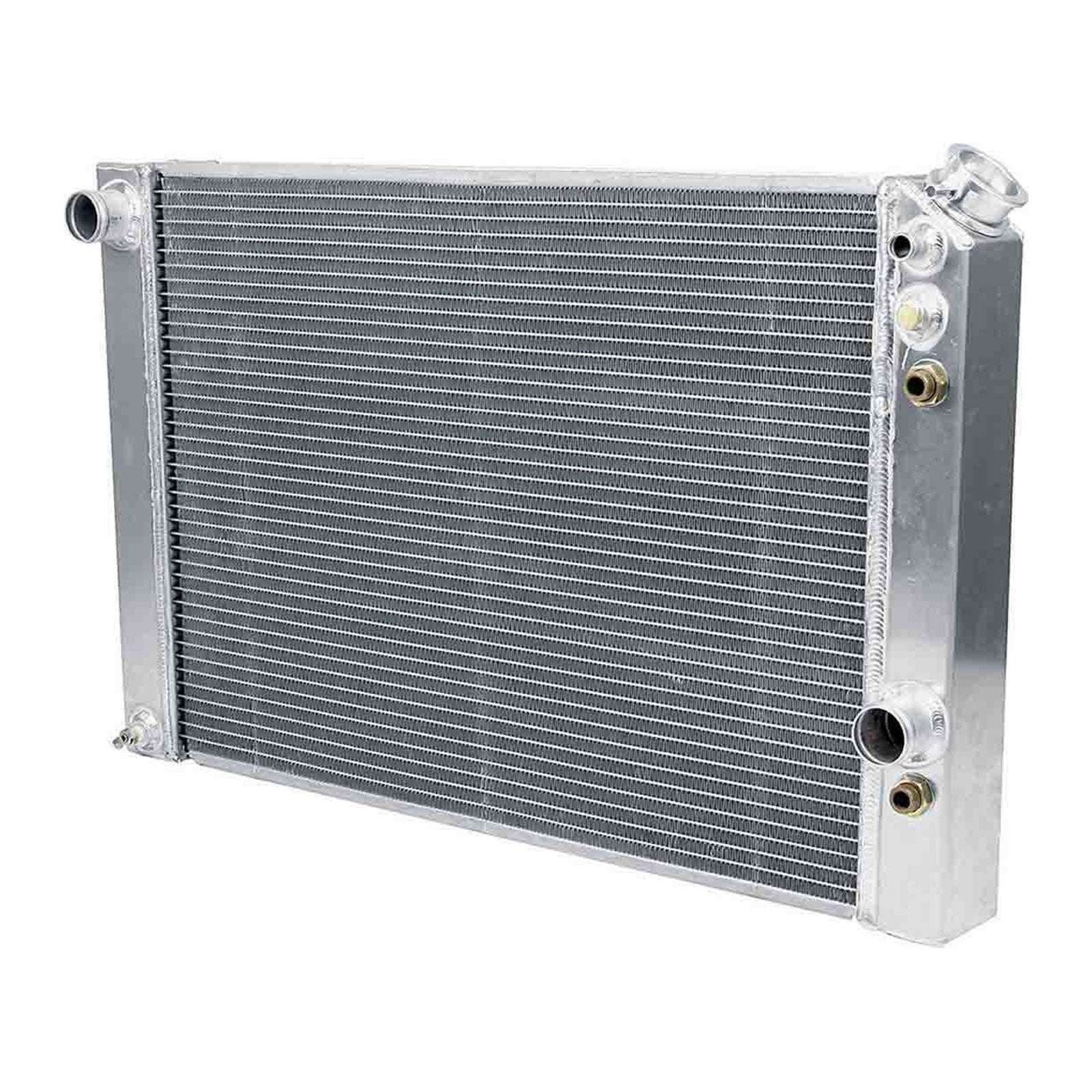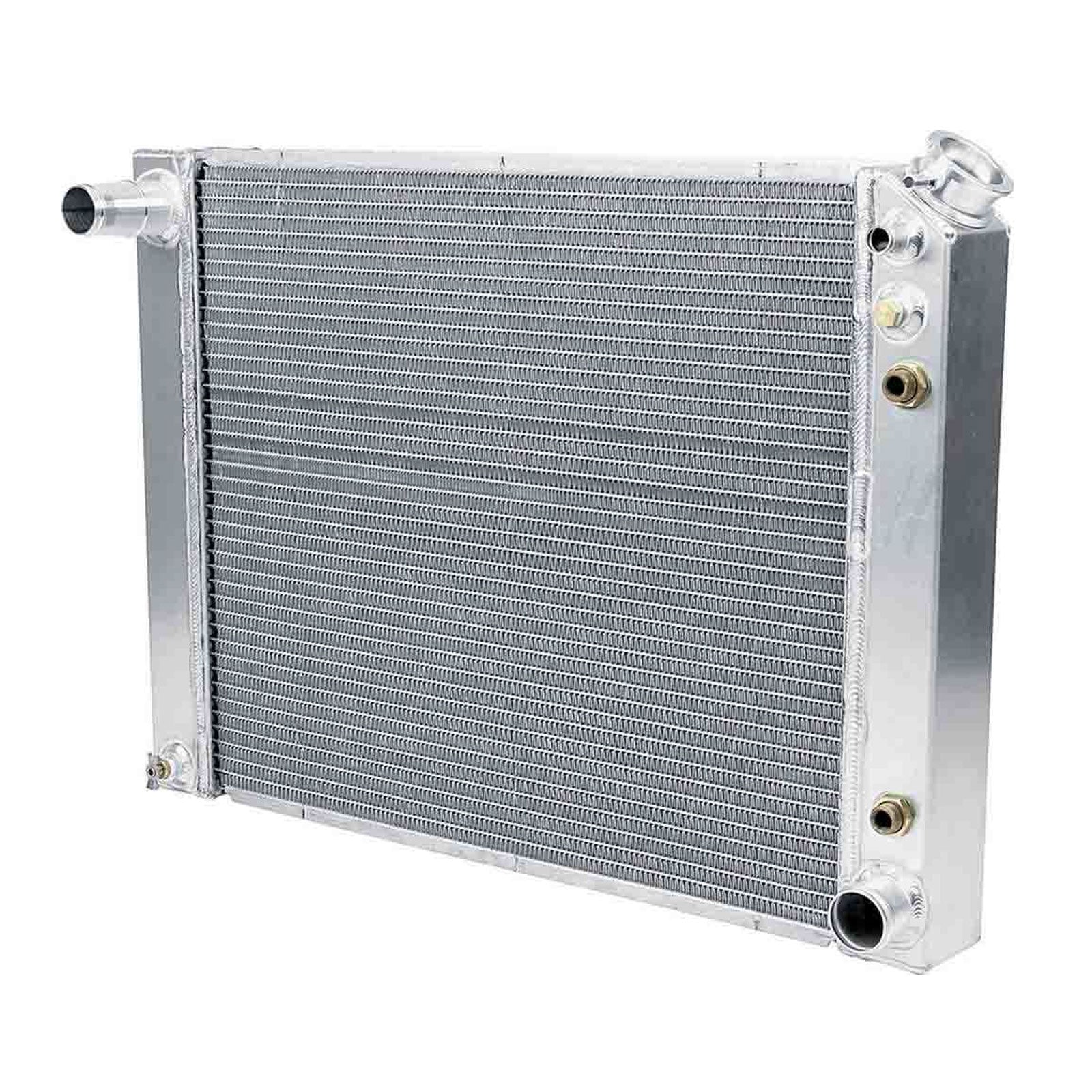 Aluminum direct fit radiators provide increased cooling over original copper radiator. Designed for performance vehicles, features include machined billet aluminum filler necks, fully welded construction and two rows of large 1" tubes properly spaced for maximum airflow and cooling on the street, even at lower speeds. Built-in automatic transmission coolers. O.E. fan shrouds may require modification for installation.