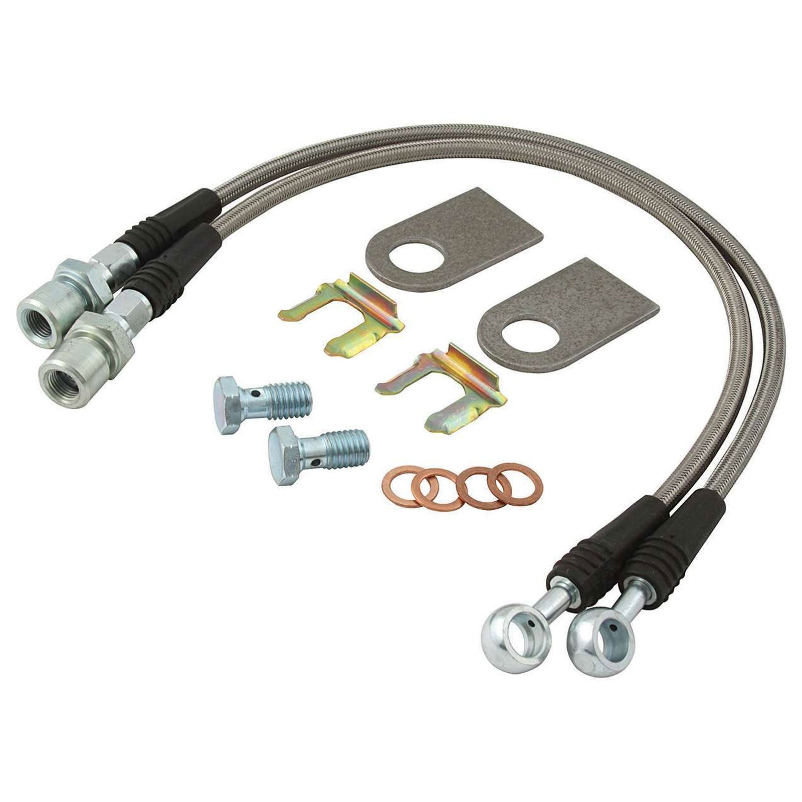 Kit includes everything necessary to complete the connection between 3/16" steel brake line and the brake caliper for one axle. Kits include two brake line adapter fittings, steel weld on tabs, retainer clips, banjo caliper fittings, banjo bolts, crush washers, and 16" DOT approved #3 braided steel hoses.